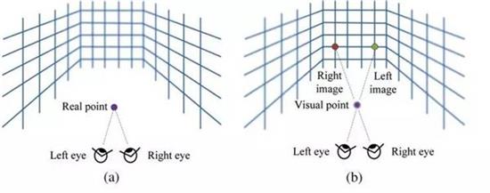 虚拟环境系统生成的两幅具有双眼视差的图像在映入视网膜之后,同现实世界一样,视线也可以聚焦于虚拟环境中的任意虚拟对象上,但是具有明显深度感的、前后位置各不相同的各个虚拟对象,不但没有发出与其所处位置相对应的散开度的光线,而且和平面图像一样,各对象发出的入瞳光线的散开度却相互几乎一致。