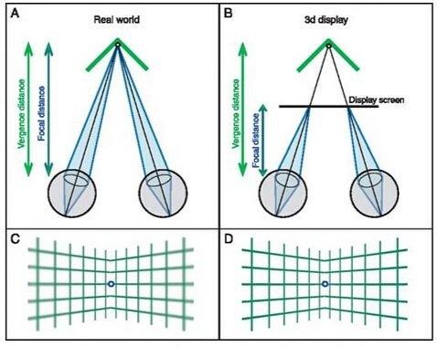 其中一个原因是因为视觉辐辏调节冲突(vergence-accommodation conflict)。