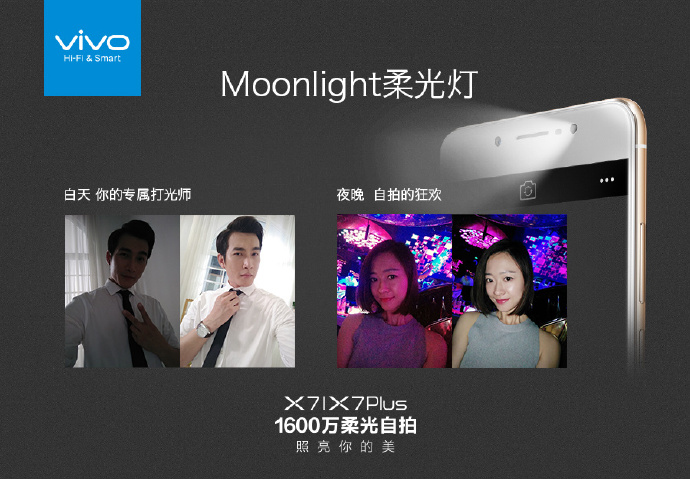 而从手机本身来说,1600万柔光自拍vivo X7不但拥有极致的外观和强劲的配置,还在极致差异化的功能上也非常突出,特别是主打的拍照,vivo X7搭载了前置1600万像素传感器,加入了针对夜间皮肤状态特殊设计的夜景美颜算法,并全球首次采用了可以模拟人像写真时使用的苹果光的Moonlight柔光灯,拥有5200K色温、0.3488/0.3838色坐标、4.6中心照度、78显色指数、20lux环境光等等多项最适合自拍的设计,让用户在自拍时肤色白皙且偏粉,亮度和反光度都达到水光感,更加健康自然、通透水润和光彩照人。