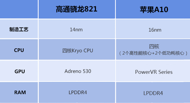 首先,按照惯例我们还是先来看看两款处理器的基本参数。巧合的是,尽管当下不乏八核、十核处理器,但是高通骁龙821和苹果A10都是四核心。其中,高通骁龙821采用更先进的14纳米工艺制程,进而保证了芯片的运算效率;而苹果A10则为16纳米工艺制程。