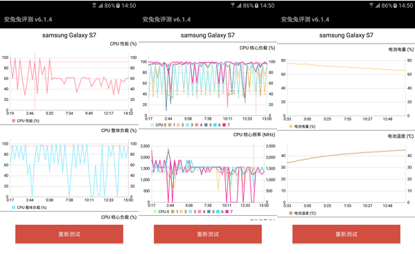 三星Galaxy S7  (三星 Exynos 8890)的测试结果——CPU前半段性能表现平稳,后半段(5:20之后)只能发挥出60%性能。CPU最高频率稳定在1500MHz。电池温度上升明显。三星 Exynos 8890后半段出现降频、锁核,影响到CPU性能发挥,手机温度上升明显。