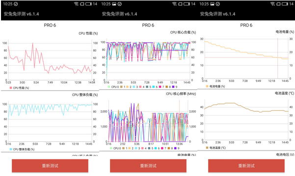 魅族Pro6(联发科Helio X25)测试结果——CPU稳定性表现一般,前半段(6分以前)能发挥出80%性能。后半段(6分以后)CPU性能在20%—40%之间波动。CPU频率波动非常大,个别核心出现了锁核的情况。电池温度方面,最高温度在42度左右,随着降频、锁核的出现,温度下降明显。