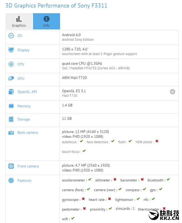 具体配置没有公布,不过此前在GFXBench数据库里曾经出现过一款型号“F3311”的索尼新机,严重怀疑就是Xperia E5。