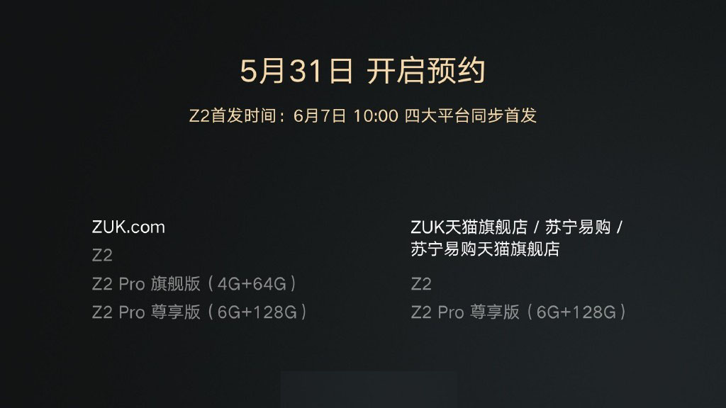 据了解,联想ZUK Z2手机售价为1799元,用户可通过联想ZUK官方网站(ZUK.com)、联想ZUK天猫官方旗舰店、苏宁易购、苏宁易购天猫旗舰店四大平台进行购买,今日(5月31日)即时接受预约,6月7日正式发售,随后亦将登陆苏宁实体店及更多其它线下店面。