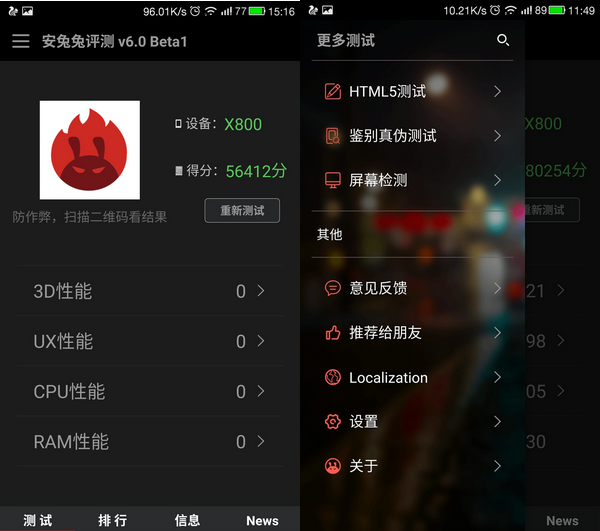 随着硬件性能的逐渐提高,用户已经从单纯的追求性能,转变到追求使用体验。因此只有符合用户的评测方式,才能够被市场所认可。安兔兔紧跟用户需求,推出了全新的V6.0版本。在V6.0版本中我们不但修改了软件界面,做了无用功能的精简。还将体验评测放在了一个全新的高度,通过加大UX测试项目比重,力求能够反映出用户真实的使用环境。