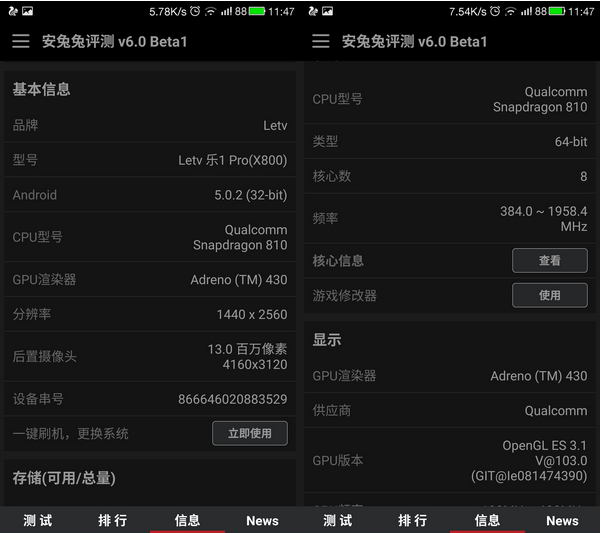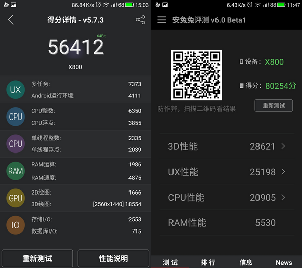 在6.0版本上,还增加了一个二维码。这个二维码主要是为防止有人用PS软件修改成绩。因为在以前的版本中,我们经常会看到有人用PS过的跑分成绩来做宣传。加入这个二维码之后,你再去PS成绩就没有用了。因为通过扫描这个二维码,我们就能够知道这部手机的真实得分。