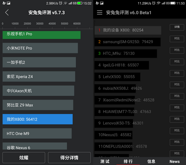 在性能排行榜这个页面改变不大,用户在性能排行界面,可以同其它型号的手机进行对比。