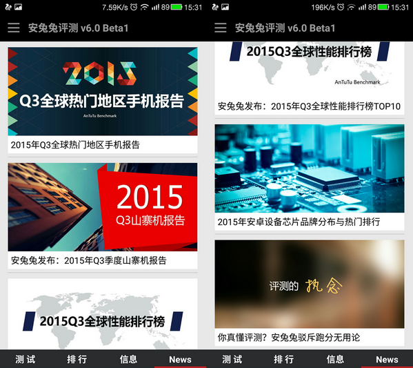 另外,我们V6.0还增加了一个资讯页面,这个页面会不定期推动一些行业动态,数据报告等,方便用户获得一手的新闻消息。当然我们也欢迎手机厂商、芯片厂商同我们展开合作,因为这里面的内容是直接推送给用户的,我们愿意提供这个平台供合作伙伴使用。