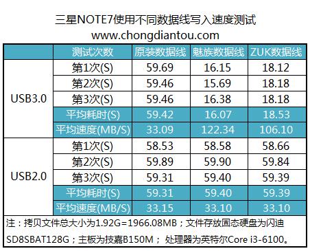 充电头网在之前测试时发现,原装Type-c数据只支持USB2.0,是否意味着三星NOTE7只支持USB2.0数据传输呢?我们拿来了魅族PRO6原装数据线和ZUK USB3.0数据线与原装数据线进行比较:
