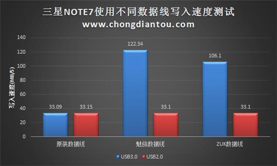 使用USB3.0接口,魅族数据线和ZUK数据线均超过100MB/S,一部2G电影20S不到,达到USB3.0标准,魅族线毫无意外排在第一。使用USB2.0接口时,三条数据线传输速度相差无几,均维持在33MB/S左右,原装数据线相比略有优势,总耗时约为USB3.0的4倍。