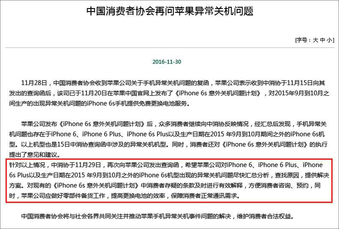对此问题,中国消费者协会已再次向苹果公司发出了查询函,希望苹果公司就“异常关机问题尽快汇总分析,查找原因,提供解决方案”。