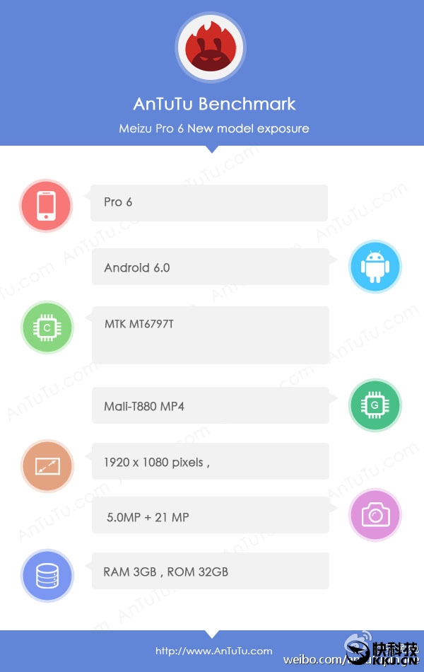 按照安兔兔的说法,PRO 6搭载联发科MT6797T处理器,屏幕尺寸不详,但分辨率依然是1080p,内置3GB内存和32GB机身存储空间,提供一颗500万像素前置摄像头和一颗2100万像素后置摄像头,运行Android 6.0系统。