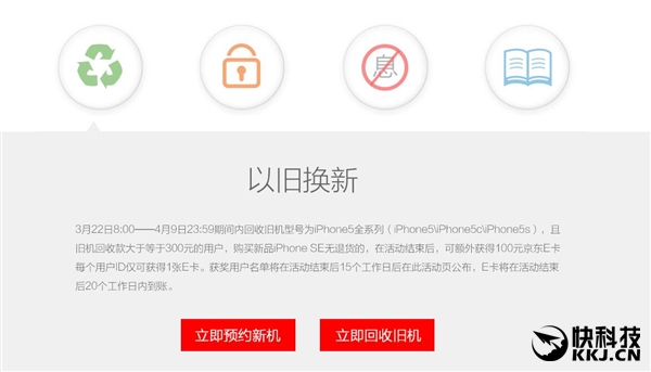 2、以旧换新:活动期间,使用iPhone5全系列(iPhone55c5s)参与以旧换新活动购买iPhone SE,可额外获得100元京东E卡。