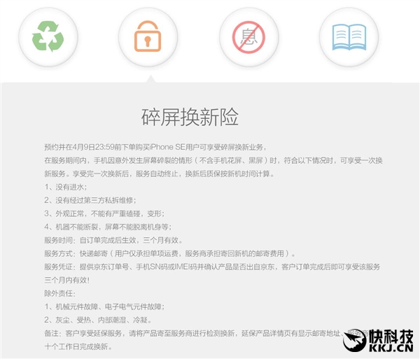 1、碎屏换新险:凡参与预约并在4月9日前下单购买iPhone新品用户,可享受碎屏换新业务。在服务期间内,手机因意外发生屏幕碎裂的情形,可享受一次换新服务。