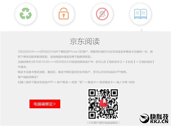 4、京东阅读全年畅读卡:凡在规定时间内下单购买iPhone SE用户,将获得京东阅读全年畅读卡兑换码一份。