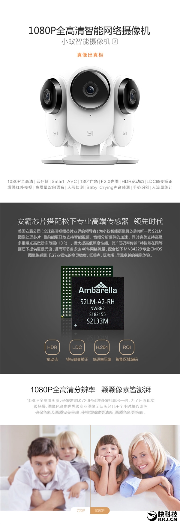它搭载美国安霸S2LM图形芯片,支持高级HDR,有效提高低照度性能。它还采用松下MN34229专业CMOS图像传感器,分辨率从720P提升到1080P全高清,支持4倍数字放大,F2.0光圈、130°超大广角(搭配LDC畸形矫正技术),同时具备高灵敏度、低噪点、低功耗的特点。