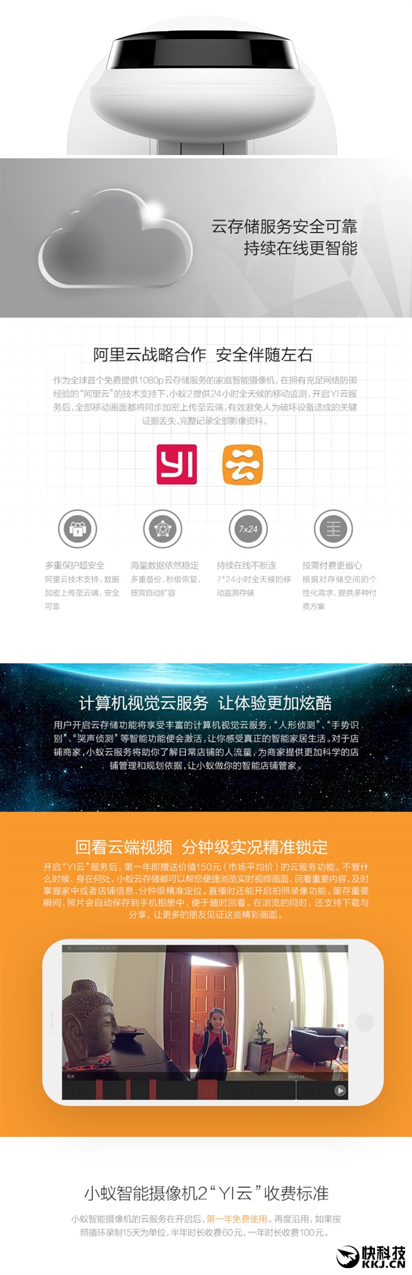 这次小蚁2提出智能网络摄像机的概念,与阿里云合作,成为全球首个免费提供1080P云存储服务的家庭智能摄像机,能够将24小时全天候检测视频同步加密上传到云端,有效避免人为破坏设备造成的关键证据丢失。