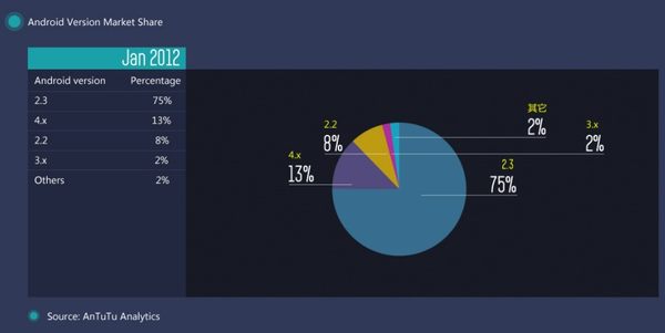 从上图可以看到,2012年1月时,由于Android 4.0冰淇淋刚发布不久,使用该系统的机器并不多,也未开始大规模的升级,所以Android 2.3还是主流的系统,达到75%之多。