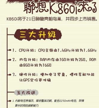 前几个月前,联想发布四核手机K860,近日,联想宣布将于12月21日发布K860的升级版K860i,联想K860i外观设计与K860一致,依然采用5.0英寸的大屏,屏幕分辨率为720p(1280*720像素),主要升级的地方集中在CPU和内存等3方面: