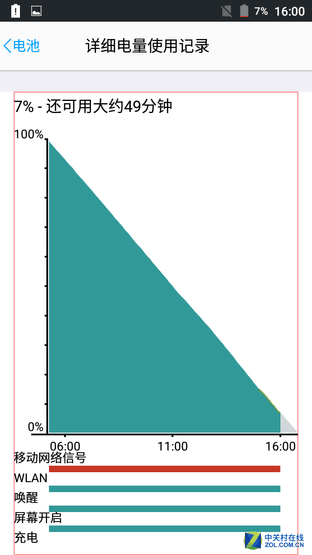 测试从早晨5点15分开始,到上午11点02分电量消耗了一半。随后视频继续播放,在下午3点的时候剩余电量为15%,触发了预设的低电量报警线。随后在16点,剩余电量达到7%,测试结束。