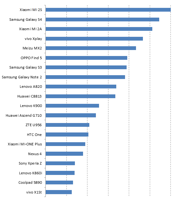 在中国区的流行安卓智能手机排行榜中,小米手机占据了前3名中的2款,甚至高过了三星Galaxy S4,这已经不是小米第一次在热门榜上超过三星了。在中国市场,人们更喜欢价格适中而性能又强的手机。同时,对比在安兔兔评测中的数据,我们发现小米这2款手机的硬件性能表现都是很好的。三星Galaxy S4虽然在流行榜中排名第二,但在我们观察到的用户拥有量数据中,其使用量是大于小米2S,只因为是中国区安卓智能手机的热门榜,而非销售量排行。