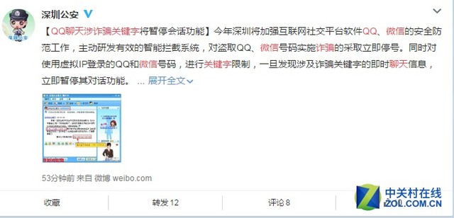 深圳公安官方微博表示:今年深圳将加强互联网社交平台软件QQ、微信的安全防范工作,主动研发有效的智能拦截系统,对盗取QQ、微信号码实施诈骗的采取立即停号。同时对使用虚拟IP登录的QQ和微信号码,进行关键字限制,一旦发现涉及诈骗关键字的即时聊天信息,立即暂停其对话功能。