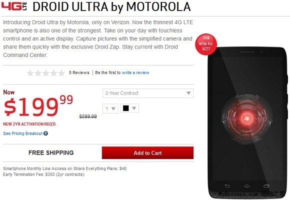 据了解,Droid Ultra、Droid Razr Maxx的两年合约价分别为199.99美元、299.99美元,而其裸机售价分别为599.99美元(折合人民币约3675元)、699.99美元(折合人民币约4287元)。
