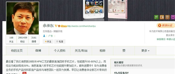 华为副总裁余承东在微博上透露了一些华为下一代手机处理器的信息,他表示“最近看了我们海思新28纳米HPM工艺的最新高端四核手机芯片,性能提升50-80%以上,而综合功耗却降低50%。
