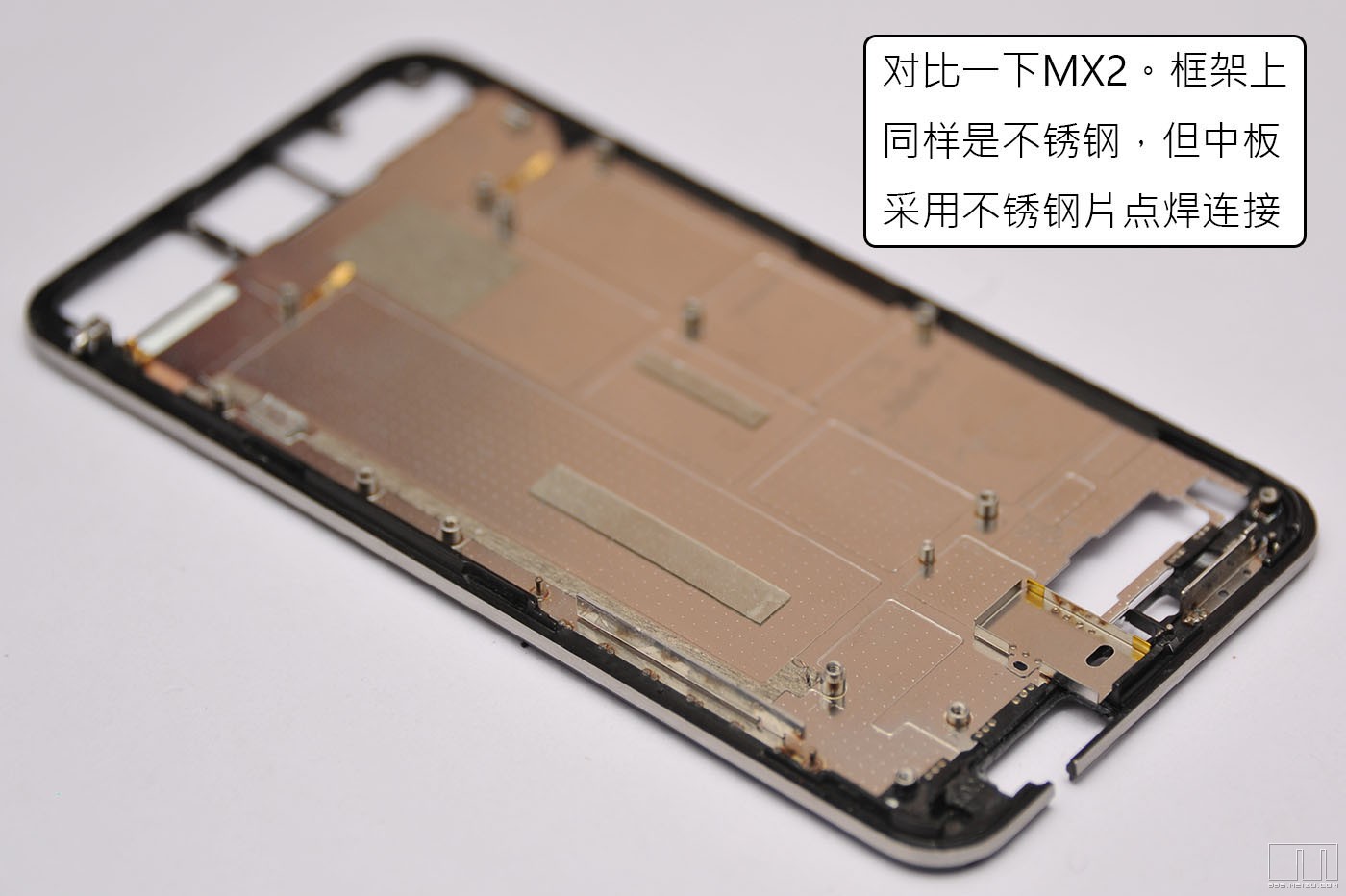 这也是为什么MZ从MX2开始,坚持用不锈钢做机身边框和骨架的原因。要在这么小的结构下实现对屏幕的足够支撑,以MZ的成本和工艺条件,不锈钢是唯一的选择。