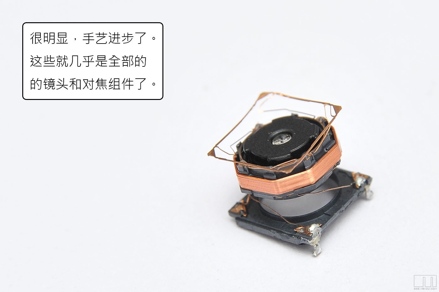 有线圈自然得有磁铁,它们就装在摄像头的四个角里。这几个磁铁的磁力强度、安装位置等,都会影响摄像头的动态参数,马虎不得。这也是对模组制造厂的考验。PS,以后大家只要看到外壳长的和MX3的摄像头差不多的,就知道这一定是台湾LITEON做的模组封装,因为LITEON好像特喜欢用这个样子的外壳。