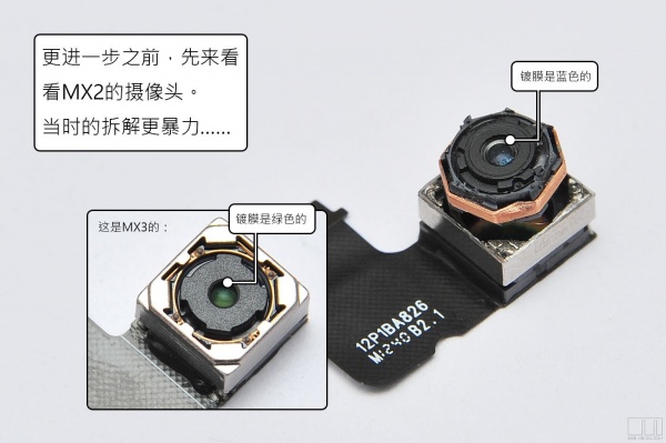 温柔向拆解里提到,从镀膜颜色来看,MX3和MX2的镜头可能来自不同的供应商,在这里,拆开摄像头以后就看的更清楚了:MX3的镜头组更小、更薄,但是画质却更好,明显是来自更强悍的供应商。至于是哪家楼主就不说了。