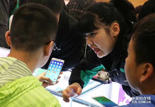 体验店开店仅几分钟,店内就已经挤满了前来体验OPPO R9的消费者,甚至店内几个体验台被团团包围,争相排队体验。工作人员也耐心为消费者详细讲解、演示OPPO R9的功能,从店内工作人员的表述中能明显看出他们早已经过严格培训。