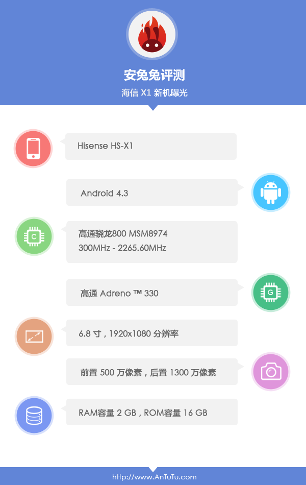 6.8寸大屏智能手机海信X1安兔兔跑分成绩不俗