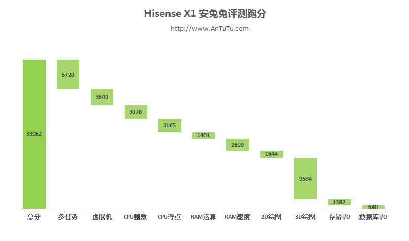 海信X1的内部型号为HS-X1,在安兔兔评测的跑分接近34000,成绩不俗。下面请看安兔兔评测的跑分详情。