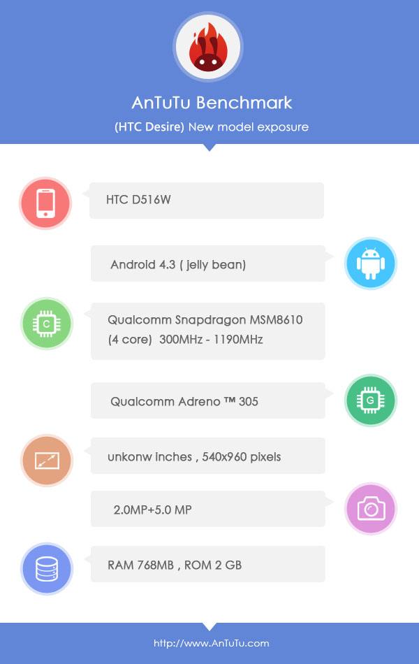 另外一款新机型号是HTC D516W,从硬件来看这款产品则是定位于更加入门的级别。