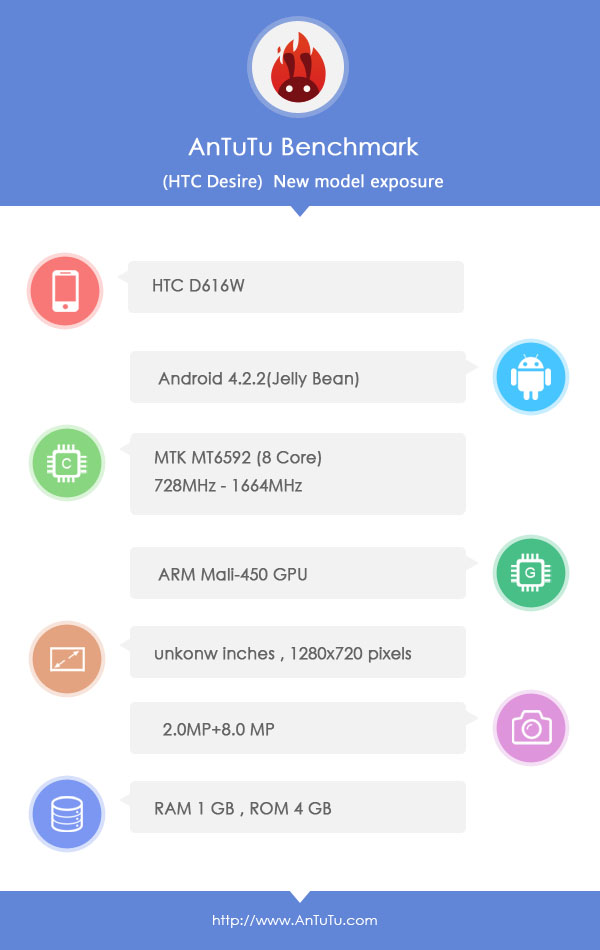 目前只知道这款手机的代号是HTC D616W,不清楚是否就是网络传闻的HTC Desire 8(硬件配置与传闻有不小的出入)。HTC D616W采用了联发科MT6592八核处理器,主频范围728MHz~1664MHz,集成Mali-450 GPU显示核心。屏幕的分辨率为1280x720,屏幕物理面积应该在5英寸左右。另外内存采用了1GB RAM+4GB ROM的组合,摄像头方面是200w前置摄像头+800W后置摄像头,运行android 4.2.2系统。