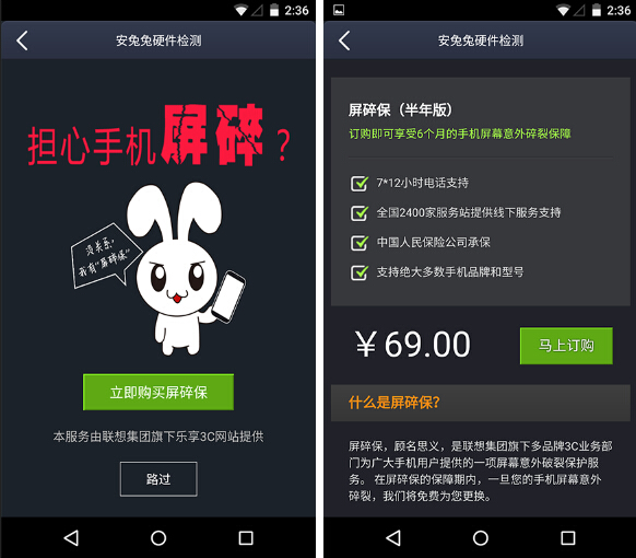 目前,随着安兔兔硬件检测版本V2.5.1的发布,正式开启与联想乐享3C推出的屏碎保战略合作。联想屏碎保是指自投保之日3个月后进入保期,为期半年的手机显示屏意外损坏将免费换新,费用为69元。这个价格只在安兔兔硬件检测中单独享用,这份保单没有对投保的手机品牌做相应的限制,是多品牌机型全能保。