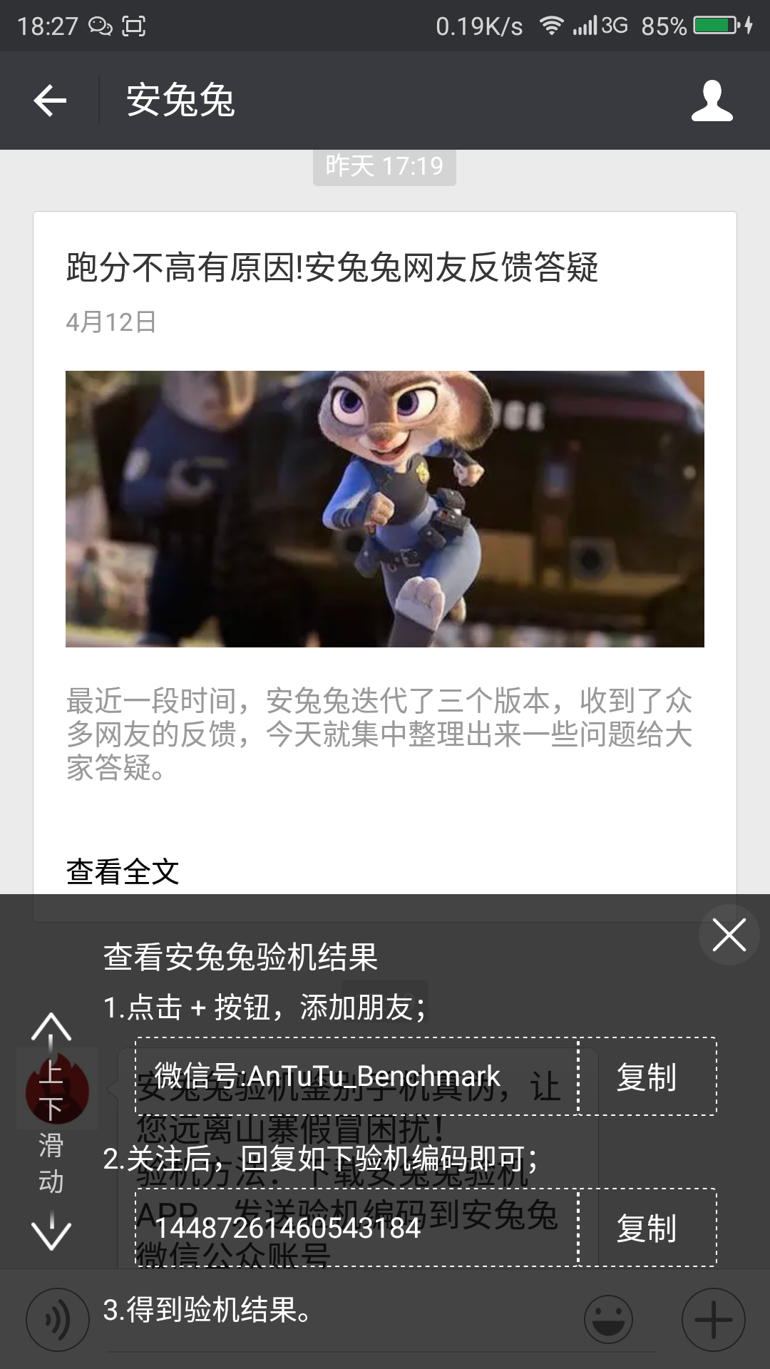一个APP好用与否,用户体验起着至关重要的作用的。因此在新版的安兔兔验机中,我们加入了微信验机这个功能。用户只需复制下手机的验证编码,发送给安兔兔微信公众账号,就能够瞬间获得检验的结果了。