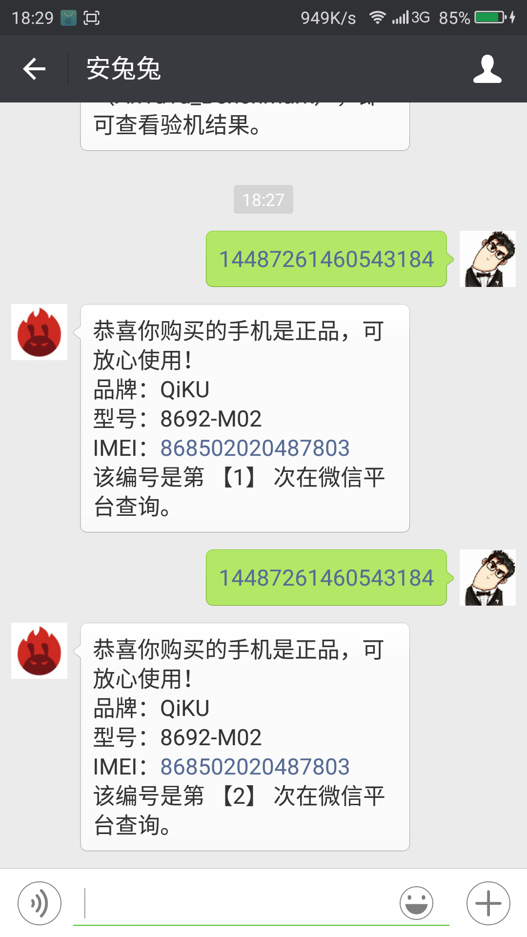4:接下来我们将这个编码发送给安兔兔微信公众账号,就能够获得验机的结果了,这样的用户体验是不是很方便?