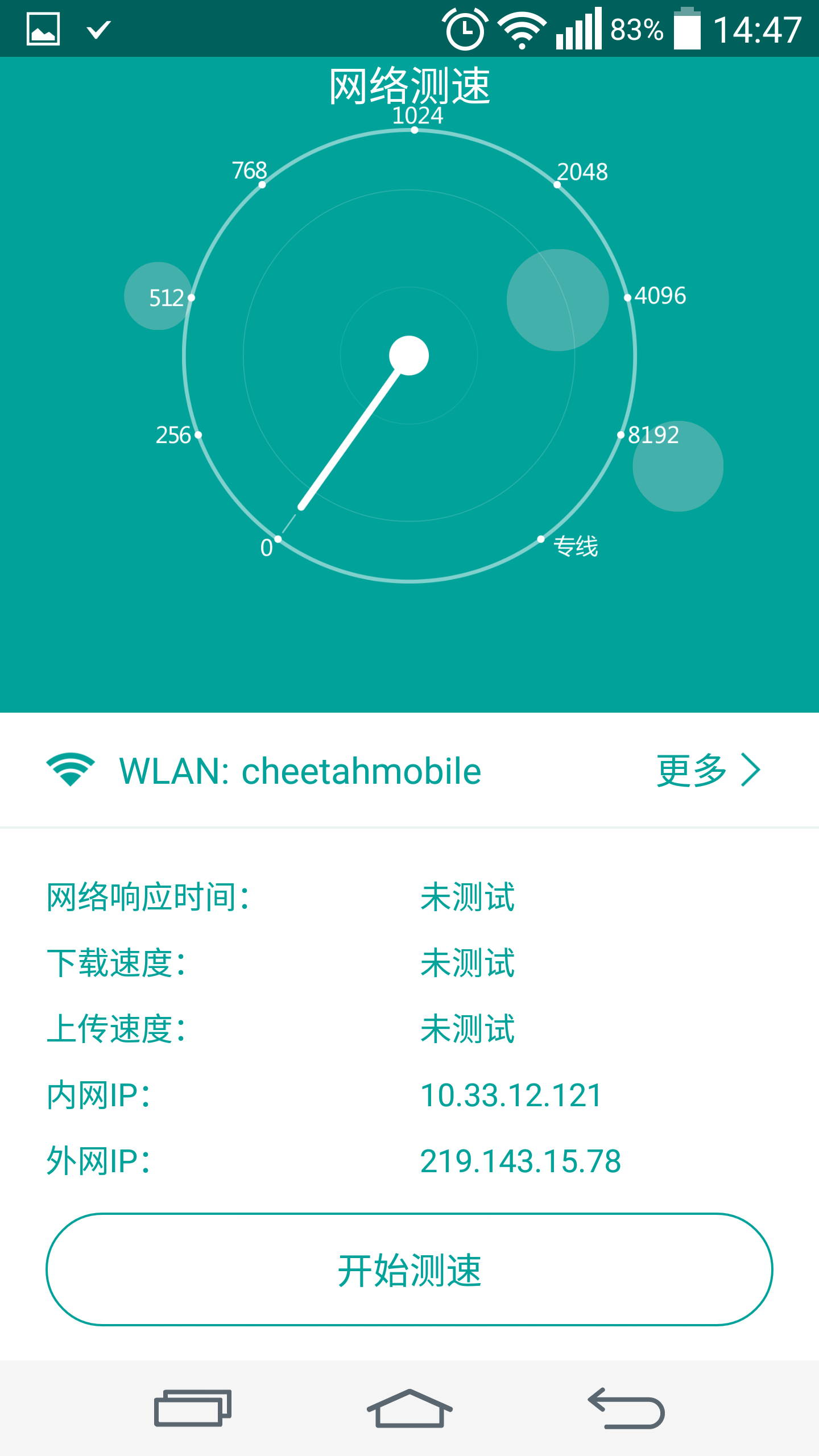 打开软件之后,我们能够看到界面左侧多了一个“网络测速”按钮。用户点击这个按钮之后,就可以进入到测速界面。这个界面非常简洁,能够为用户展现出网络名称、内网IP、外网IP。也就是说“网络测速”功能不但可以用户检测手机网络,还可以用来检测WIFI网络。