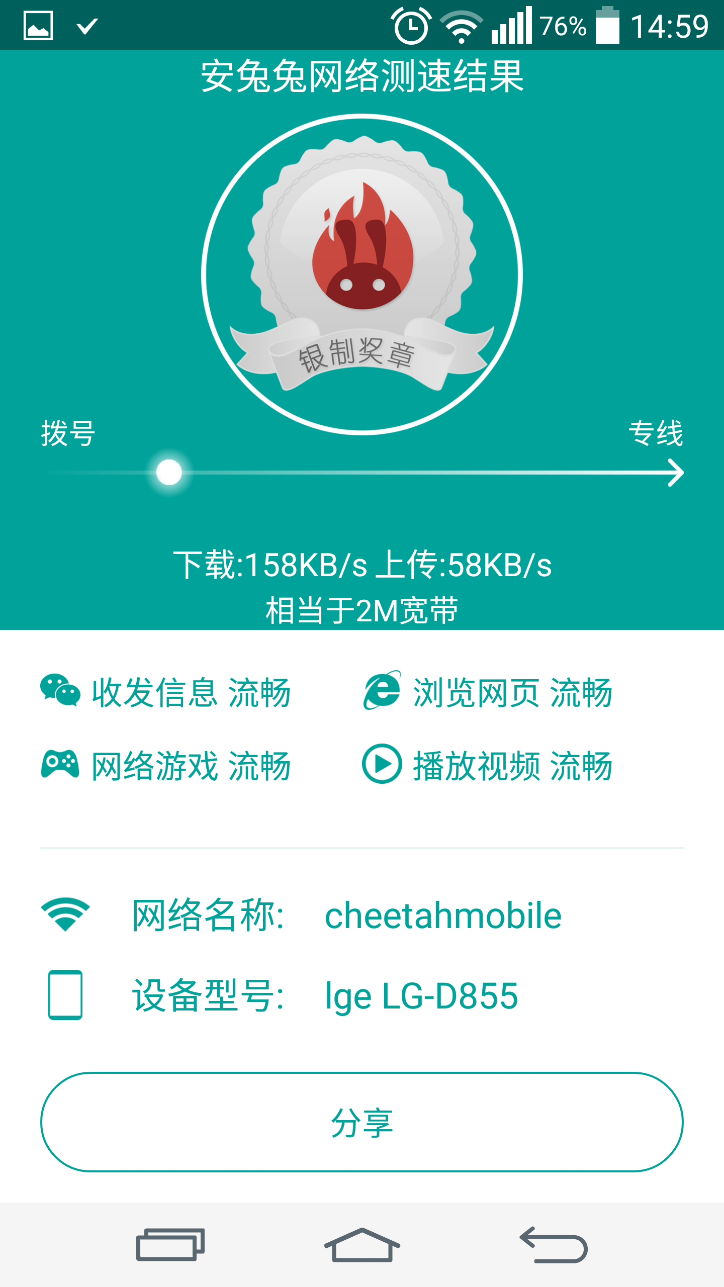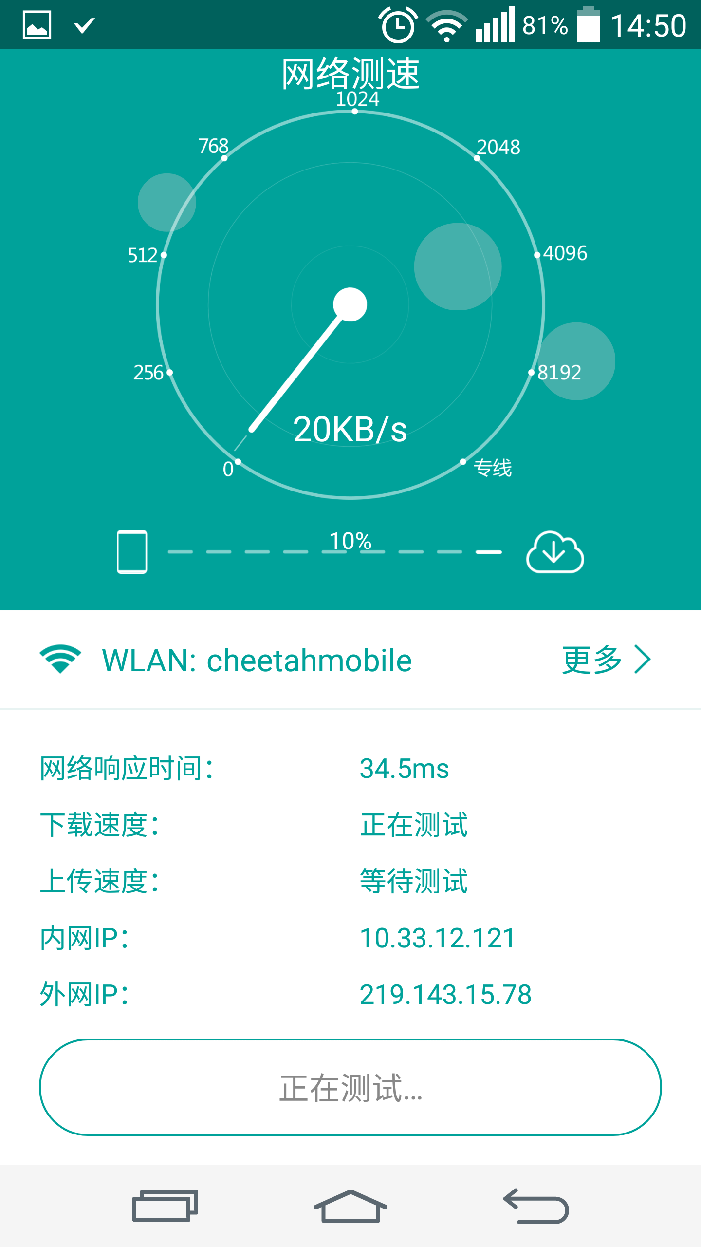 网络测速会告诉用户当前的网络响应时间、上传/下载速度,从而为用户提供参考。另外对于那些需要查找内网IP/外网IP的朋友来讲,只需要连接WIFI就能够看到了,再也不用去电脑端敲指令代码了。测试完成之后,软件还会根据测试结果提醒用户是否流畅。从网络测速这个小功能的加入,我们可以看到安兔兔已经从单一的手机性能测试延伸到了手机网络测试方面,这个小小的改变可以看出安兔兔对用户用心、负责的态度。