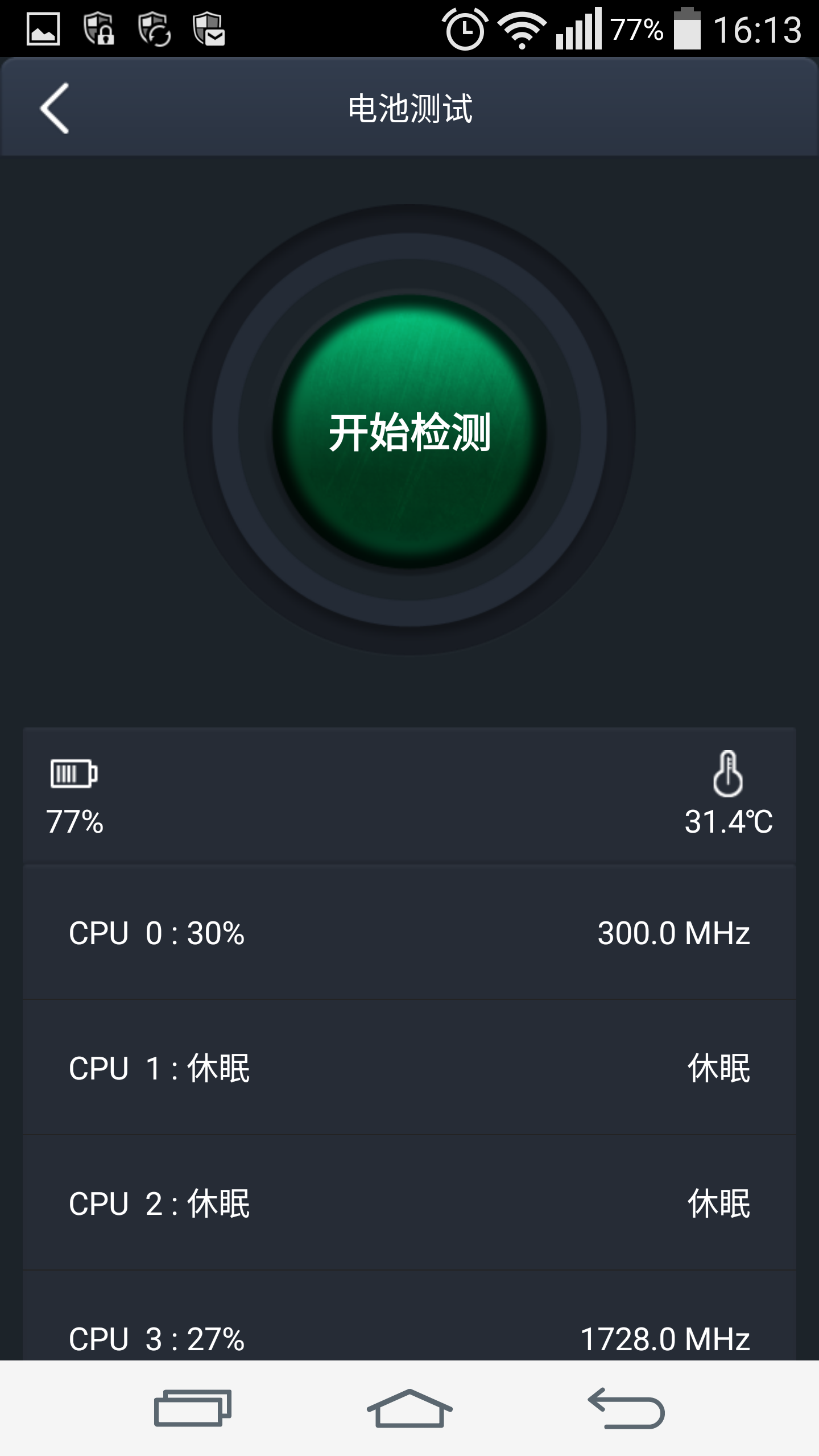 在硬件检测界面我们还可以查看电池温度以及CPU占用率,你可别小看这两个小功能,这对远离电池爆炸可有着不小的作用。