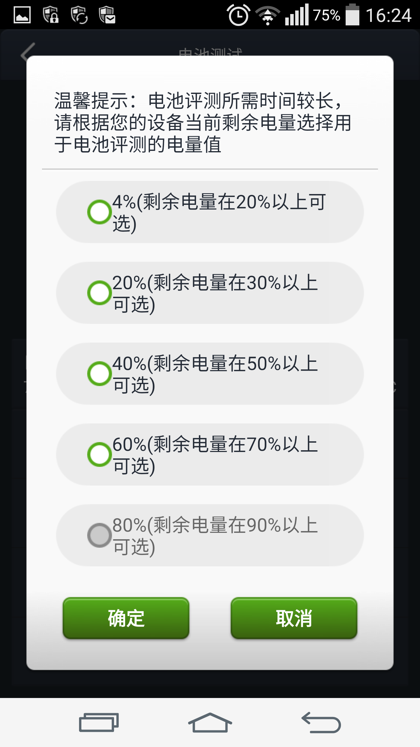 点击开始检测按钮就会弹出百分比选择界面。这个界面主要是为解决测试时间过长而设计的,因为在以前的版本中,用户只能选择100%,然后一个测试要等上3个多小时,这样对手机和人都是一个煎熬。如今用户可以手动选择百分比,就可以根据自己的时间选择测试时间了。