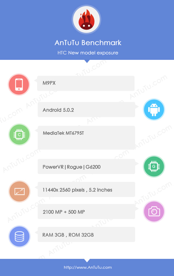 HTC M9px 将搭载联发科MT6795T处理器,采用3GB RAM+32GB ROM,屏幕为5.2英寸2K分辨率,摄像头为2100万+500万。
