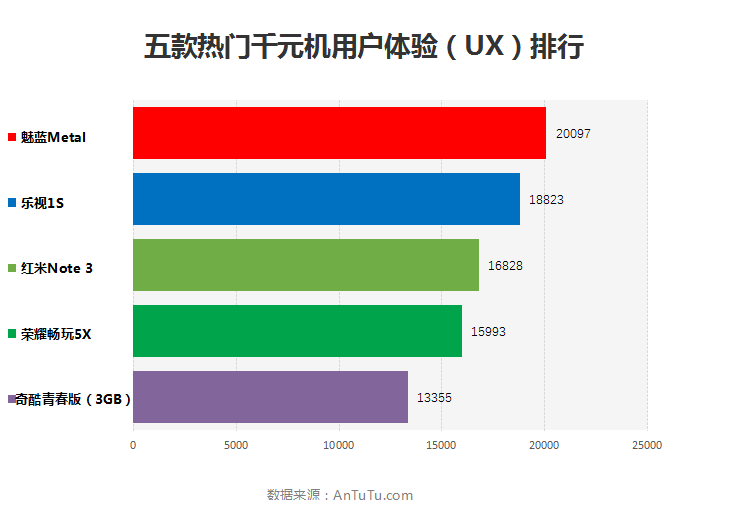 安兔兔V6.0版本大幅增加了UX测试比重,很多人可能不懂UX测试成绩代表什么。其实我们可以将UX测试理解为用户体验测试,这项测试主要是用来检测手机的使用感受,譬如你的手机卡、慢等问题,都可以通过UX测试项目展现出来。在这5款手机的UX测试对比中,魅蓝Metal的得分最高,乐视1S排名第二,奇酷青春版垫底。另外UX的得分也同芯片性能有直接关系,荣耀畅玩5X(骁龙616)和奇酷青春版(MT6753)在芯片性能方面,明显不如另外三款手机(MT6795)。