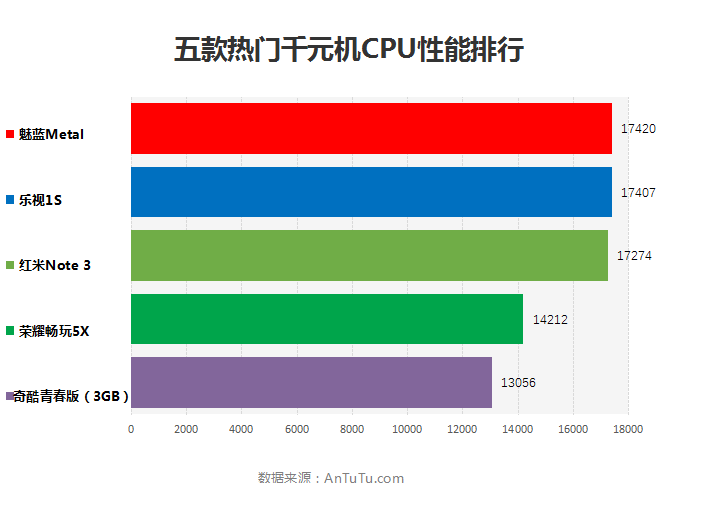 在CPU性能对比方面,红米Note3、魅蓝Metal、乐视1S在CPU成绩方面接近(都是MT6795芯片),荣耀畅玩5X以及奇酷青春版不占有优势。