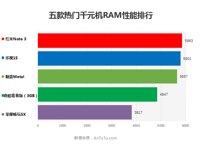 在手机RAM容量方面,这几款手机当中只有荣耀畅玩5X和魅族的Metal配备的是2GB内存,其它几款手机采用的都是3GB内存。体现在RAM成绩方面,荣耀畅玩5X的成绩明显要落后其它几款。