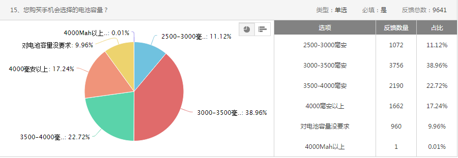 从功能机发展到智能机阶段,手机已经进化成了智能终端。用户已经从单纯的打电话、发短讯,转变为“多样化需求”。其中聊天、听音乐、看视频,已经超过了基本功能。很多人对现有手机最不满意的地方是耗电严重、续航差!在电池选择偏好方面,用户偏向选择3000毫安到4000毫安电池容量区间。
