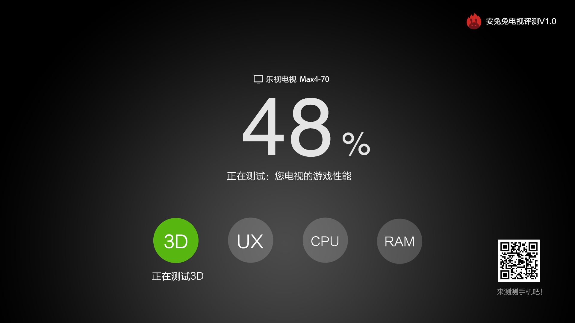 安兔兔电视评测,还增加了一个二维码,在测试过程中(以及软件退出页面),都会出现这个二维码。用户扫描二维码后,能够下载手机评测软件。这样用户做电视性能评测的时候,也能顺便进行手机性能测试。