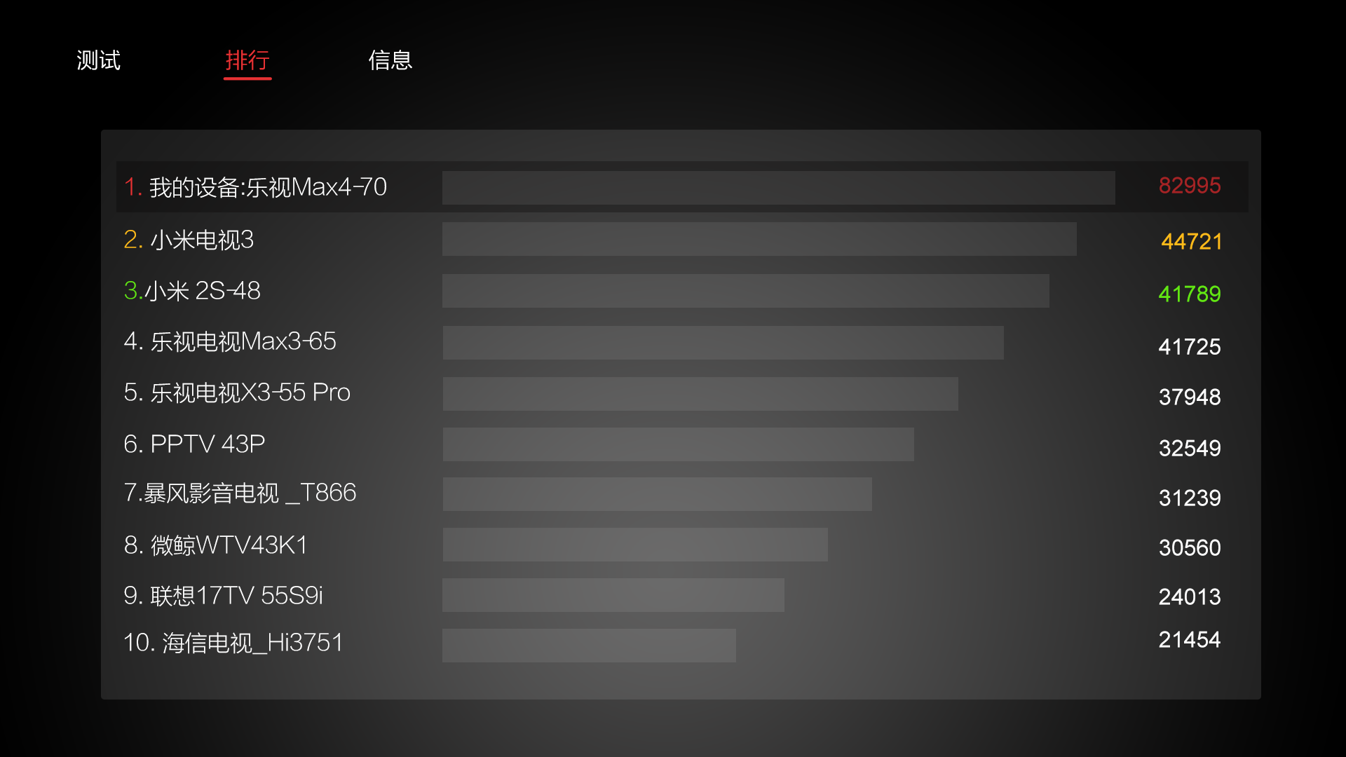 在排行页面内,网罗了主流的电视跑分成绩,用户完成测试之后,会看到属于自己的排名。PS:目前这个页面仅支持性能排行,未来我们会加入更多维度的排行,尽最大可能满足用户需求。